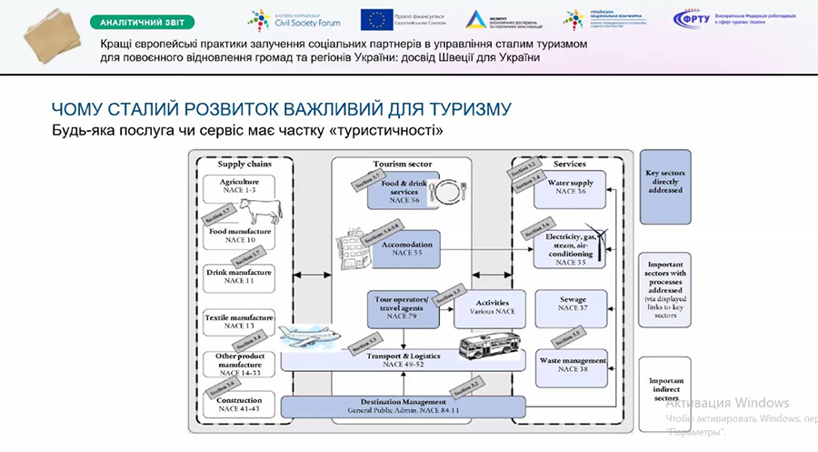 Тетяна Тимошенко у своїй промові підкреслила унікальну роль туризму, як одного з найбільших ефективних інструментів економічного розвитку громад і регіонів у післявоєнний період. На її думку, необхідно розпочати діалог щодо місії, моделі, напрямів та інструментів розвитку туризму в Україні з урахуванням успішних світових прикладів та на основі концепції сталого розвитку. Відновлення туристичної сфери має набути ознак керованого процесу, щоб забезпечити реалізацію принципів системності, послідовності та сталого розвитку . Дуже важливим є вивчення передового досвіду успішних туристичних країн у посткризовому відновленні туризму, зокрема, таких як Шрі-Ланка після війни у В’єтнамі, досвід Франції під час впровадження реформи децентралізації, напрямки післявоєнної відбудови туризму у Німеччини та у ряді балканських країн. Важливим питанням розвитку галузі, особливо на місцевому рівні, на думку Тетяни Тимошенко, має стати кадрове забезпечення. Щоб сформувати ефективні стратегії розвитку туризму, а потім успішно їх реалізувати, відповідальні особи повинні мати знання, сучасні технології та відповідні управлінські навички.