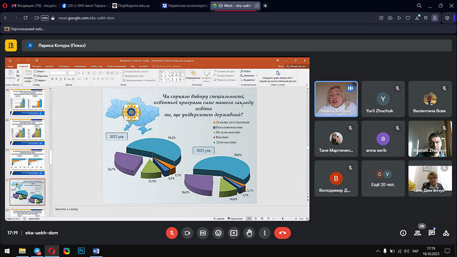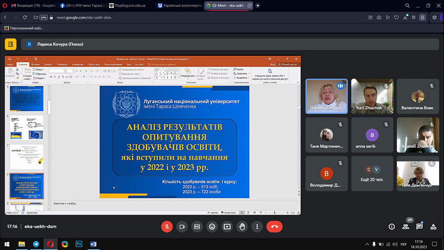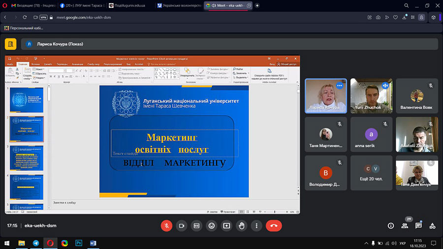 В онлайн-заході приймав участь і відділ маркетингу ЛНУ імені Тараса Шевченка. Керівник Лариса Кочура представила співробітників відділу і запропонувала до перегляду присутнім відео-презентацію «Маркетинг освітніх послуг».