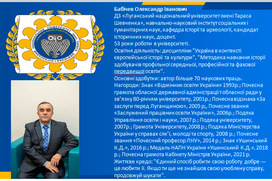 Привітав спільноту університету від навчально-наукового інституту соціальних і гуманітарних наук Олександр Іванович Бабічев (стаж роботи – 53 роки), кандидат історичних наук, доцент, Почесний професор університету, Заслужений працівник освіти України, який довгий час працював на посаді проректора університету з науково-педагогічної роботи. Він зазначив, що головним багатством університету є люди, які вистояли у складних умовах евакуацій, гідно тримаються, рухаються вперед, роблять все можливе, аби зберегти репутацію та традиції рідного закладу освіти.