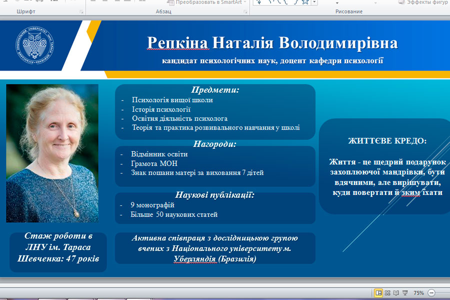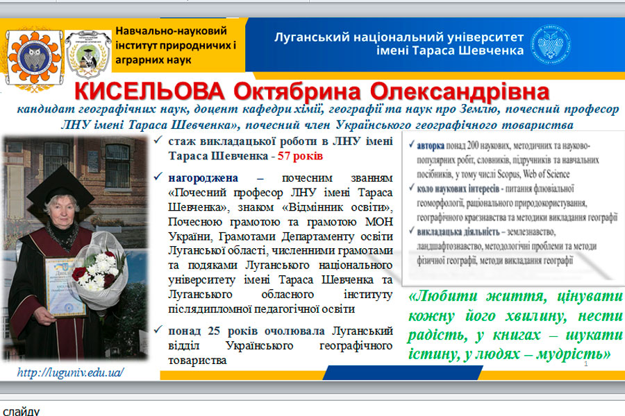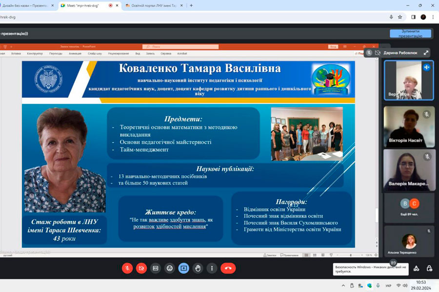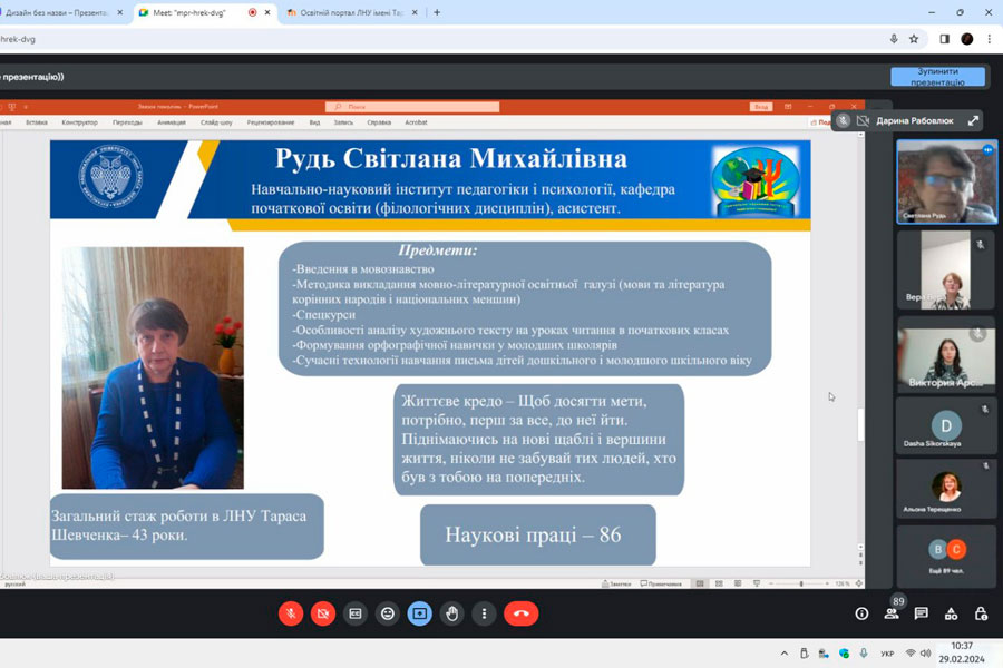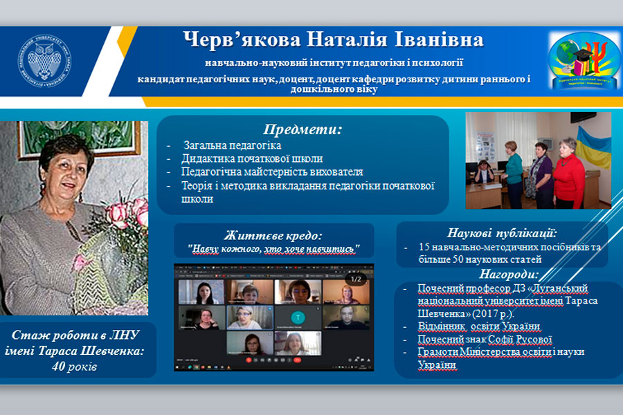 Напередодні відзначення 103 річниці від дня заснування нашого університету відбулася урочиста онлайн-зустріч «Зв'язок поколінь» із ветеранами педагогічної праці. Захід об’єднав викладачів та здобувачів освіти усіх структурних підрозділів ДЗ «Луганський національний університет імені Тараса Шевченка», які розташовані у Полтаві, Миргороді та Лубнах. Модератором зустрічі була заступник директора з соціально-гуманітарної роботи навчально-наукового інституту педагогіки і психології.