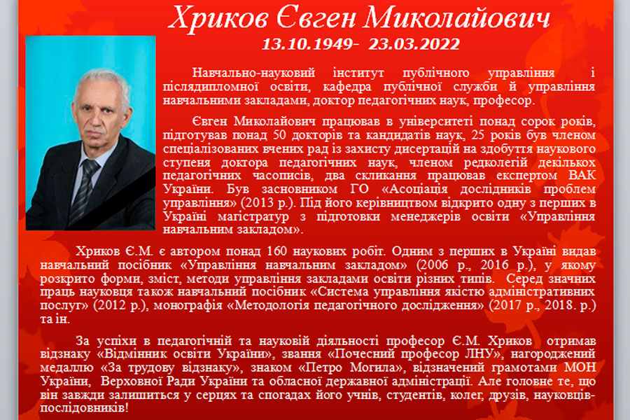 В скорботі і з великою вдячністю згадали тих, хто відійшов у вічність. Викладач кафедри публічної служби й управління навчальними закладами Євген Іванов розказав про Євгена Миколайовича Хрикова, доктора педагогічних наук, професора навчально-наукового інституту публічного управління і післядипломної освіти, який загинув від рук російських агресорів. Присутні вшанували пам'ять дорогих серцю людей, які працювали у різних структурних підрозділах, хвилиною мовчання.