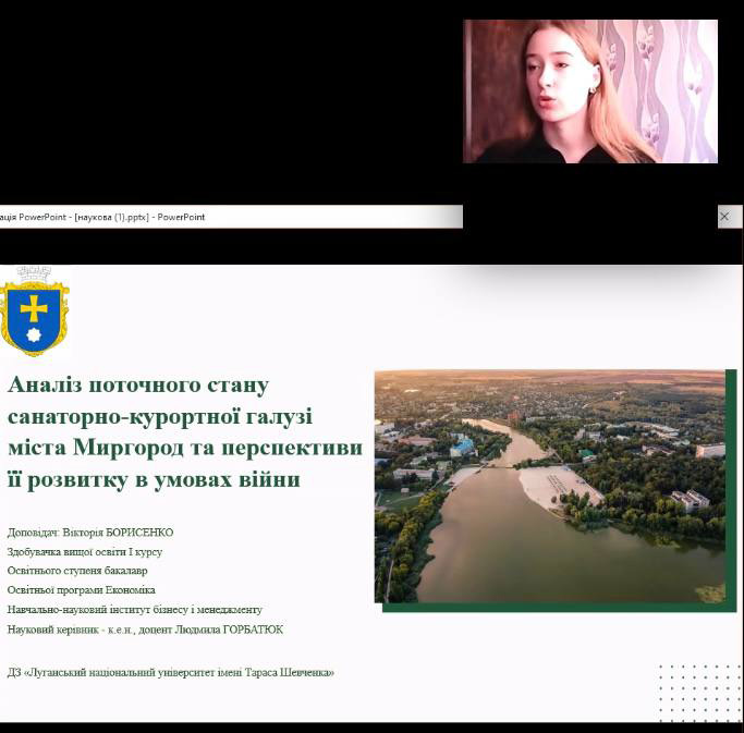 7 травня 2024 року, на базі Факультету економіки і менеджменту Сумського НАУ, відбулась підсумкова конференція Всеукраїнського конкурсу студентських наукових робіт з економіки, на якій робота здобувачки вищої освіти освітньої програми Економіка Навчально-наукового інституту бізнесу і менеджменту, Вікторії БОРИСЕНКО, на тему: «Аналіз поточного стану санаторно-курортної галузі міста Миргород та перспективи її розвитку в умовах війни» здобула першість в тематичному напрямі: «Економіка місцевого розвитку».