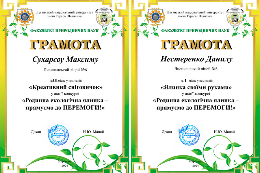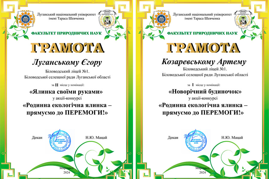 Усі учасники отримали грамоти та подяки за участь у конкурсі за номінаціями: «Ялинкова прикраса», «Декоративна свічка», «Ялинка своїми руками», «Малюнок, аплікація», «Новорічний віночок», «Новорічний букет», «Незвичайна ялинка», «Новорічна композиція», «Символ року», «Новорічна іграшка», «Креативний сніговичок», «Новорічний будиночок».