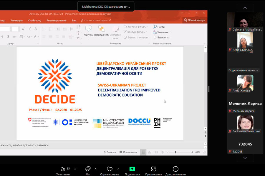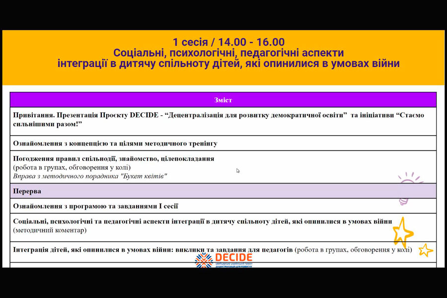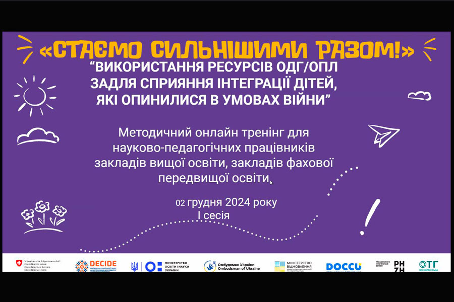 Викладачі кафедри початкової освіти Катерина Коваленко, Тамара Маркотенко та Лариса Мельник беруть активну участь у методичному тренінгу для науково-педагогічних працівників закладів вищої та фахової передвищої освіти на тему «Використання ресурсів ОДГ/ОПЛ задля сприяння інтеграції дітей, які опинилися в умовах війни». Захід, організований у межах Швейцарсько-українського проєкту «DECIDE – Децентралізація для розвитку демократичної освіти», спрямований на підвищення кваліфікації педагогів задля сприяння інтеграції дітей, які опинилися в умовах війни.
