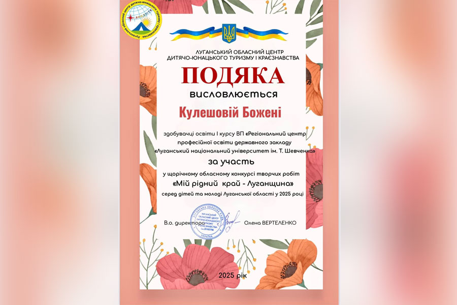 Щиро вітаємо Божену Кулешову - студентку І курсу ВП «Регіональний центр професійної освіти Державного закладу «Луганський національний університет імені Тараса Шевченка» з отриманням Подяки від Луганського обласного центру дитячо-юнацького туризму і краєзнавства за участь у конкурсі «Мій рідний край — Луганщина»!