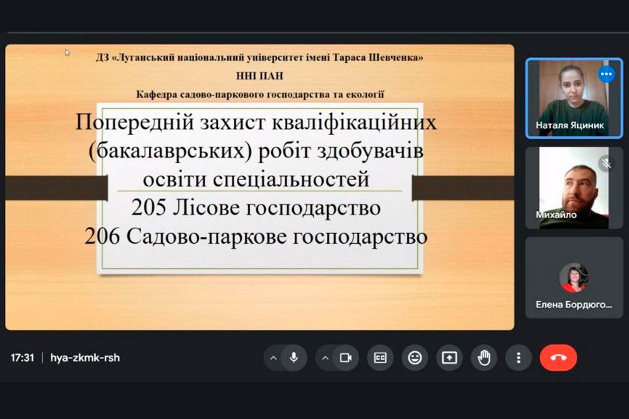 На кафедрі садово-паркового господарства та екології відбувся попередній захист кваліфікаційних (бакалаврських) робіт здобувачів вищої освіти спеціальностей 205 Лісове господарство та 206 Садово-паркове господарство. Захід проходив 23 та 24 травня 2024 року у дистанційному форматі за допомогою платформи Google Meet, де кожен здобувач мав можливість представити результати своєї наукової праці перед викладачами кафедри.