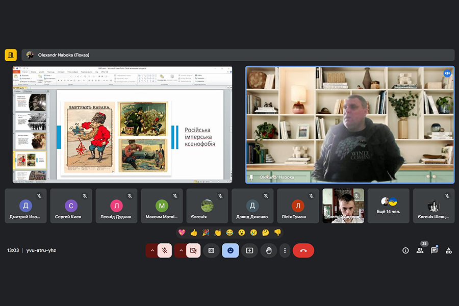 Олександр Набока провів історичні аналогії сьогоднішньої війни в Україні із іншими агресивними війнами, які вела Росія/СРСР протягом своєї історії. Як відзначив доповідач, останні завжди відрізнялися крайньою лицемірністю у виправданні своїх експансіоністських намірів. «Сьогодні, як ніколи, на практиці можна простежити брехливість російської інтерпретації своїх «народних воєн», які найчастіше були спровоковані саме московською ксенофобією», – зазначив автор заходу.
