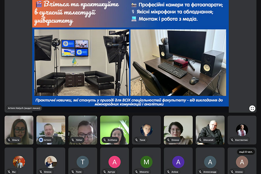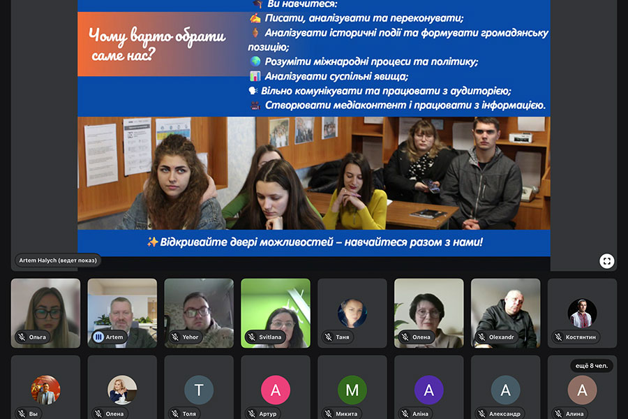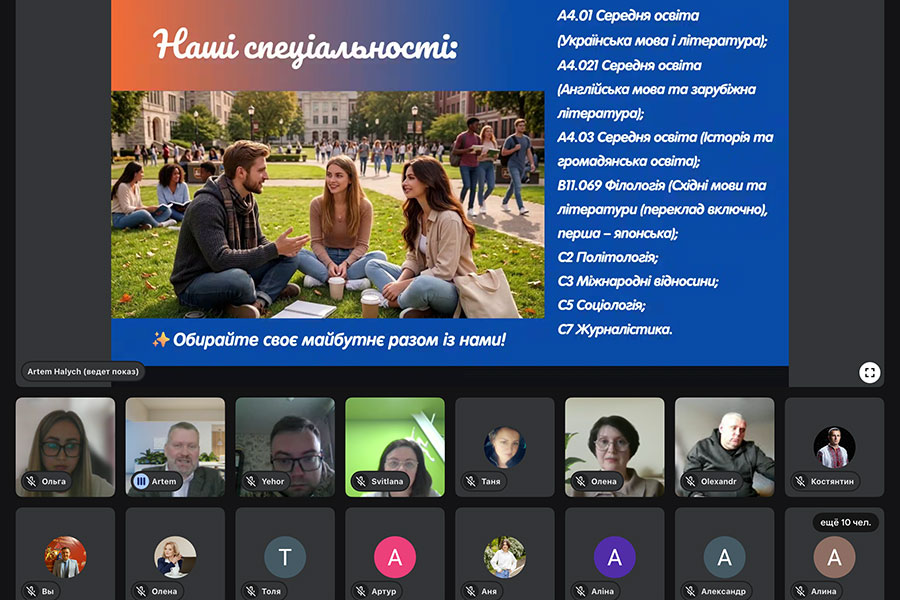 Під час зустрічі в. о. декана факультету соціальних і гуманітарних наук Артем Галич представив учасникам освітні програми факультету, продемонстрував презентацію спеціальностей та окреслив основні переваги навчання. Зокрема, було відзначено наявність університетської телестудії, комфортних сучасних аудиторій, сучасної бібліотеки, а також сприятливих умов для практичної підготовки здобувачів освіти. Особливу увагу було приділено умовам вступу, етапам вступної кампанії, термінам подання заяв через електронний кабінет, а також можливостям, які відкриваються перед здобувачами освіти після завершення навчання.
