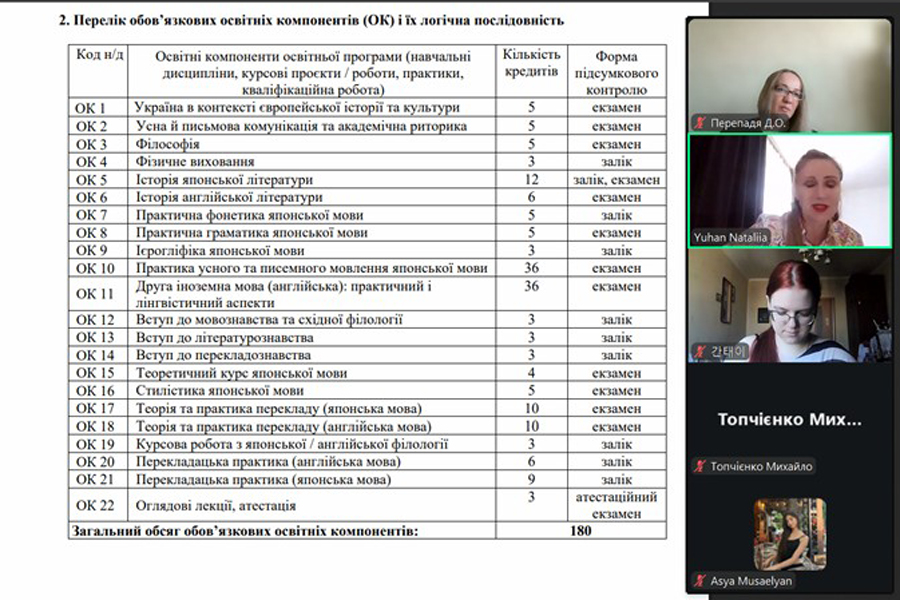 Гаранти програм приділили окрему увагу особливостям ОП, зокрема їх унікальності серед інших подібних програм в університетах України, а також окреслили можливості індивідуальної траєкторії навчання засобами дисциплін вільного вибору. Крім того, виступала проф. Юган Наталія, яка повідомила про розроблені нею освітні компоненти, присвячені сучасній японській літературі.