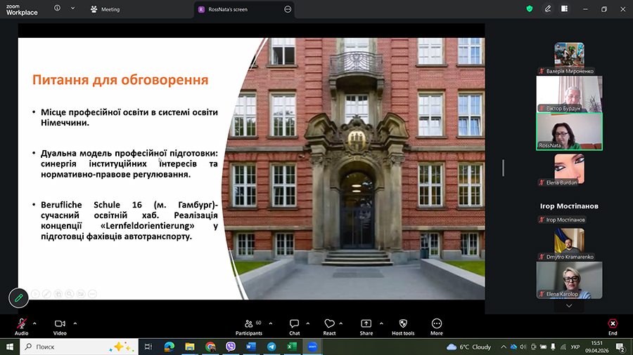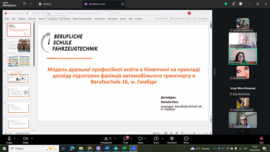 Тема доповіді «Модель дуальної професійної освіти в Німеччині на прикладі досвіду підготовки фахівців автомобільного транспорту в Berufsschule 16 м. Гамбург (Німеччина)».