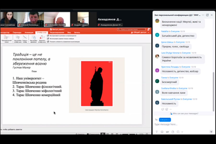 Особливістю зустрічі став інтерактивний формат. Протягом лекції слухачі ділилися в чаті власними визначеннями того, ким для них є Тарас Шевченко. Фінальним акордом стало створення «хмари слів», яка трансформувалася у портрет поета. Кожен учасник отримав це унікальне зображення на згадку – як символ того, що образ Кобзаря складається з думок і почуттів кожного з нас.