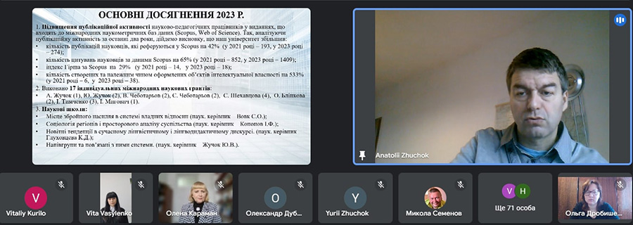 Nataliia Bykadorova, a representative of the presidium of the Primary Trade Union Organization of the University, started the work of the conference of the labor team, who noted that 55 members of the labor team were present out of 64 delegates to participate, and proposed to hold a joint meeting of the conference and the Academic Council.