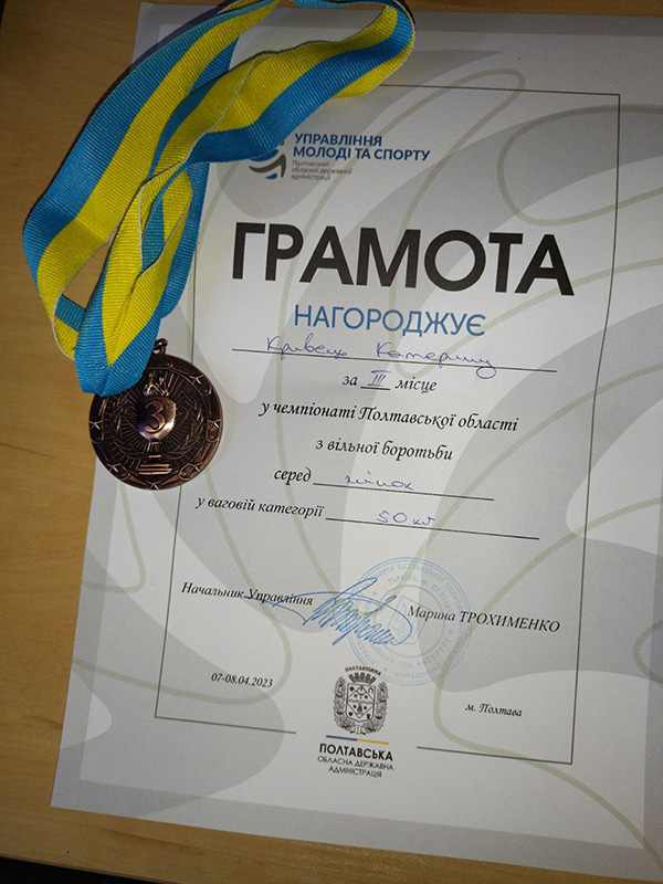 7-8 квітня 2023 року естафету продовжила Кривець Катерина студентка першого курсу спеціальності «Середня освіта. Фізичка культура» ставши бронзовою призеркою у чемпіонаті Полтавської області з вільної боротьбі серед жінок у ваговій категорії 50 кг.