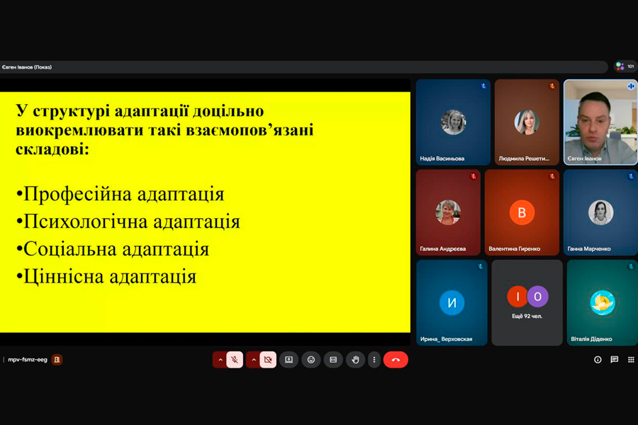 Модераторкою заходу виступила керівниця проєкту Надія ВАСИНЬОВА, кандидат педагогічних наук, доцент. Спікером став Євген ІВАНОВ, кандидат педагогічних наук, доцент кафедри публічної служби й управління навчальними закладами, який представив практичні підходи до реалізації ветеранської політики, окреслив виклики та поділився досвідом успішної адаптації ветеранів і ветеранок у професійному середовищі.