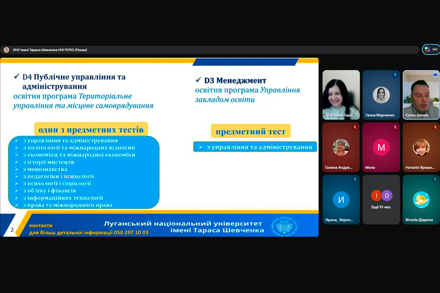 Наприкінці зустрічі присутні отримали інформацію щодо можливості навчання за другим (магістерським) рівнем вищої освіти на освітніх програмах «Територіальне управління та місцеве самоврядування» (спеціальність D4 Публічне управління та адміністрування), «Управління закладом освіти» (спеціальність D3 Менеджмент), тематика освітніх компонентів яких охоплює сучасні проблеми публічного управління та освітнього менеджменту.