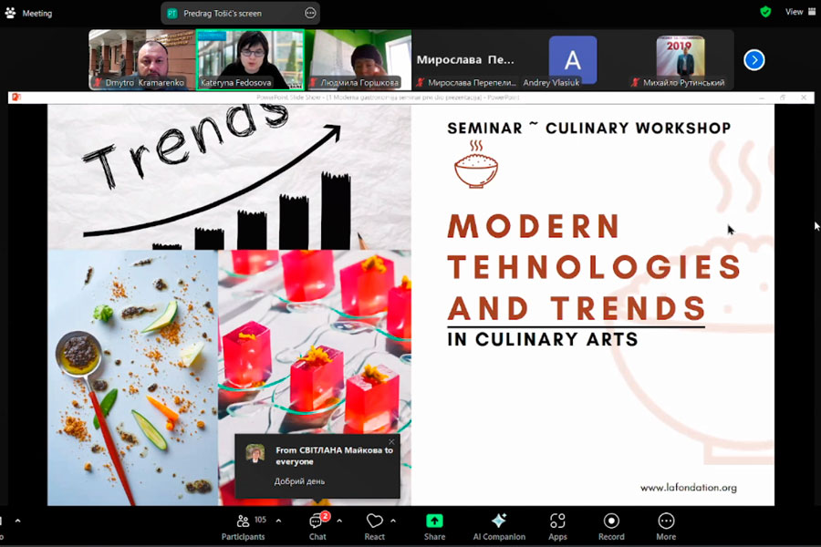18 березня 2025 року викладачі кафедри професійної освіти, ресторанного і туристичного бізнесу та здобувачі вищої освіти зі спеціальностей «Готельно-ресторанна справа», «Туризм і рекреація», «Професійна освіта (Аграрне виробництво, переробка сільськогосподарської продукції та харчові технології)» відвідали міжнародний онлайн-семінар «Сучасні технології та тренди в кулінарному мистецтві» від кафедри Готельно-ресторанного бізнесу Одеського національного технологічного університету. Захід, що проводився англійською мовою за підтримки La Fondation pour la Formation Hôtelière, представив учасникам всебічний огляд інноваційних кулінарних технологій.