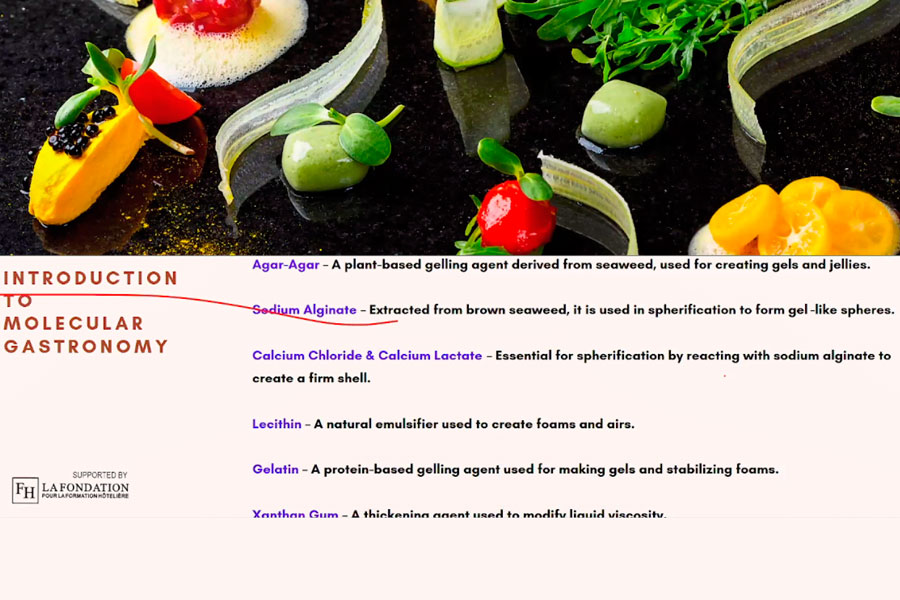 Протягом сесії були розглянуті різноманітні теми, включаючи молекулярну гастрономію, 3D-друк їжі, процеси ферментації та кулінарію з використанням штучного інтелекту. Учасники отримали знання про спеціалізовані інгредієнти, такі як агар-агар, альгінат натрію та лецитин, які використовуються в сферифікації та інших сучасних кулінарних техніках.