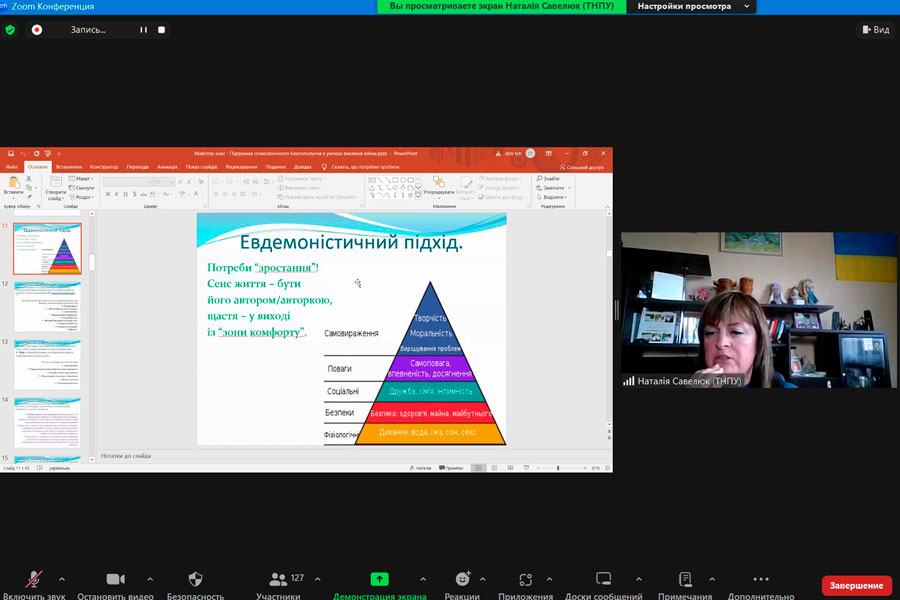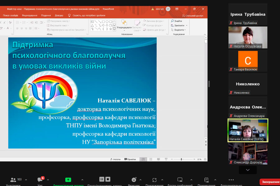Спікером зустрічі стала докторка психологічних наук, професорка, професорка кафедри психології Тернопільського національного педагогічного університету імені Володимира Гнатюка Савелюк Наталія Михайлівна.