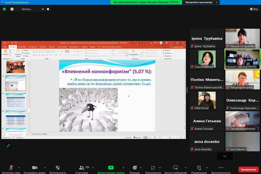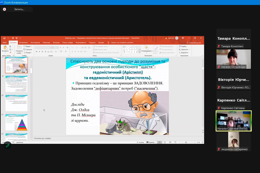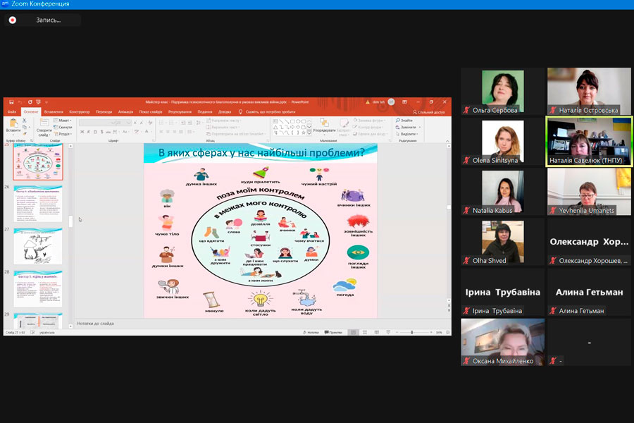 У теоретичному блоці заходу учасники отримали можливість оговорити основні підходи до визначення психологічного благополуччя; розглянути структуру психологічного благополуччя (за К. Ріфф); поспілкуватися про невизначеність і війну. Практичний блок вебінару дозволив учасникам відпрацювати діагностичні методики, проаналізувати дані емпіричних досліджень та отримати практичні поради щодо підтримки психологічного благополуччя в умовах викликів війни.