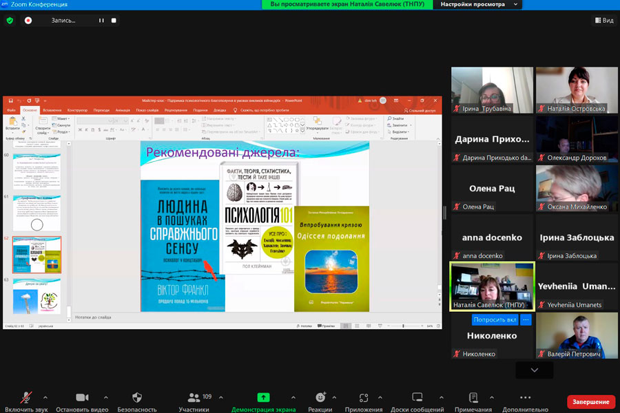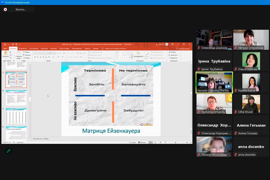 З цією метою 7 травня 2024 р. кафедрою соціальної педагогіки навчально-наукового інституту педагогіки і психології ДЗ «Луганський національний університет імені Тараса Шевченка» та кафедрою соціальної педагогіки і соціальної роботи Криворізького державного педагогічного університету було організовано 13 зустріч Всеукраїнського вебінару «Сучасні виклики соціальної роботи» на тему: «Підтримка психологічного благополуччя в умовах викликів війни».