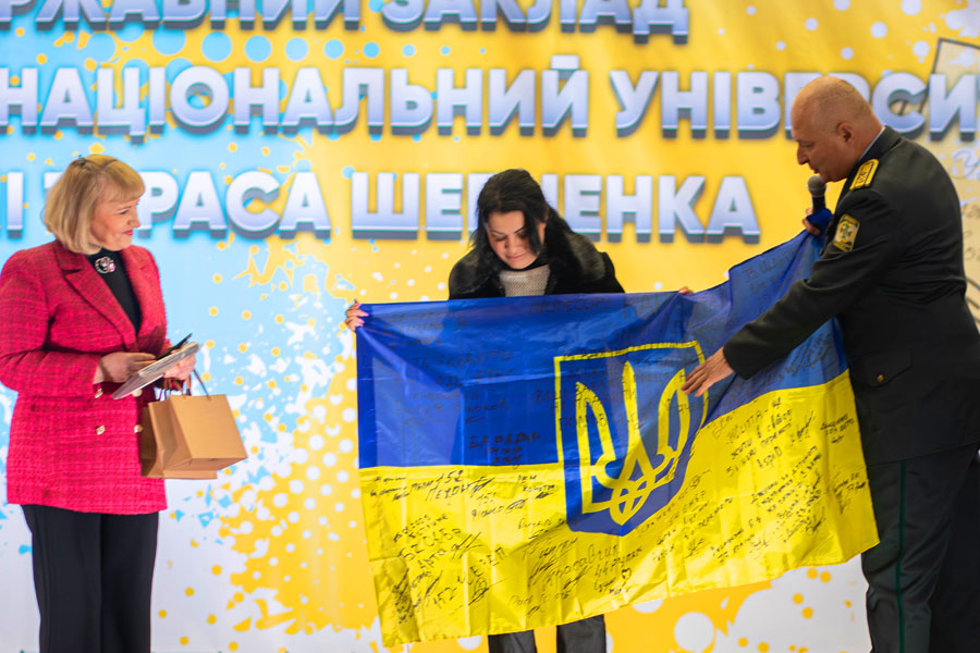 Зворушливою миттю стало вручення бойового прапора університету. Волонтерка з 2014 року, керівниця Благодійного фонду «Честь і Совість» Оксана Каневська передала прапор з передової — з місця, де сьогодні пишеться сучасна історія боротьби. Цей стяг — не просто тканина. Це — пам’ять, біль, надія, символ незламності. Святиня, яка надихатиме ще багато поколінь.
