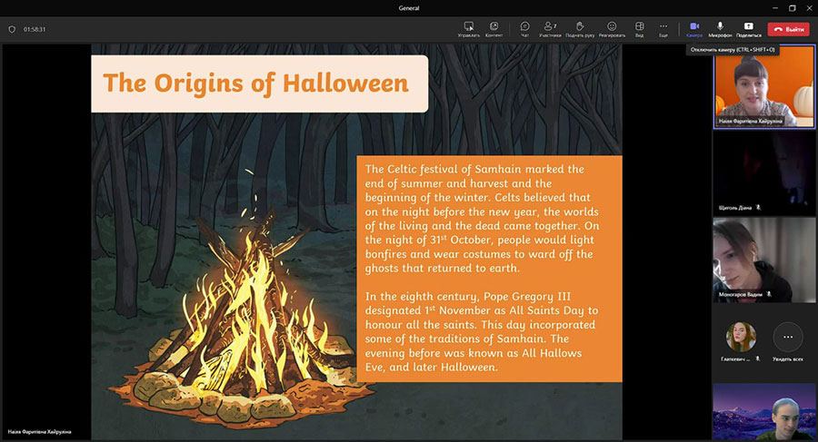 У рамках вивчення культури англомовних країн 31 жовтня викладачі кафедри романо-германської філології (доц. Хайруліна Н.Ф. та доц. Юніна О.Є.) зорганізували та провели тематичний захід присвячений святу Гелловін англійською мовою.