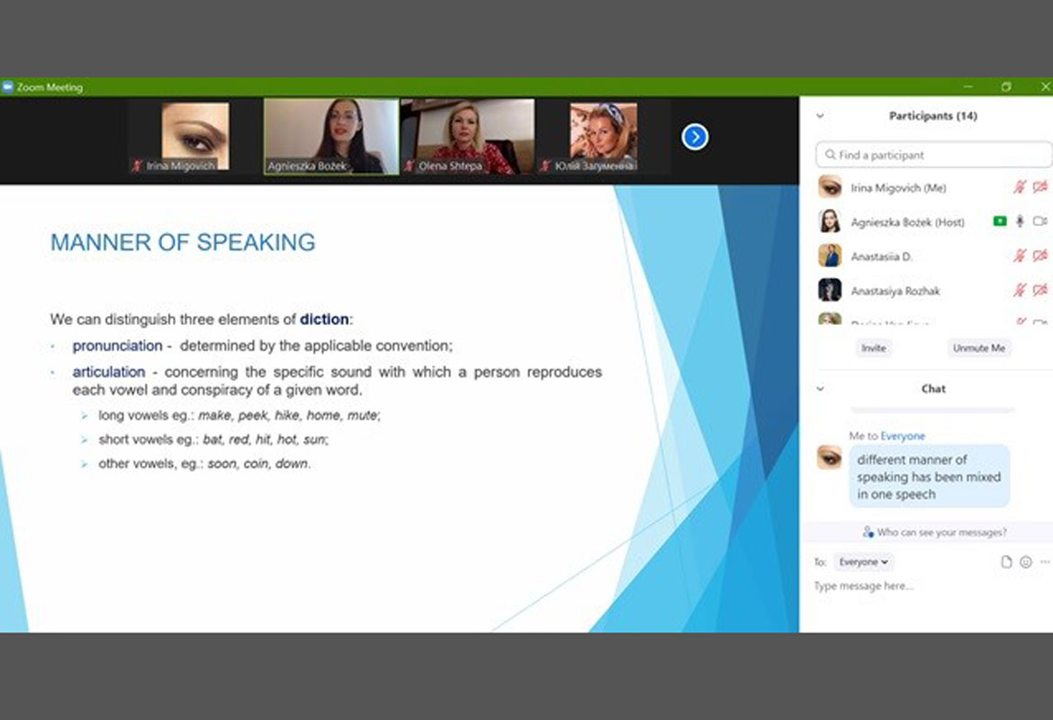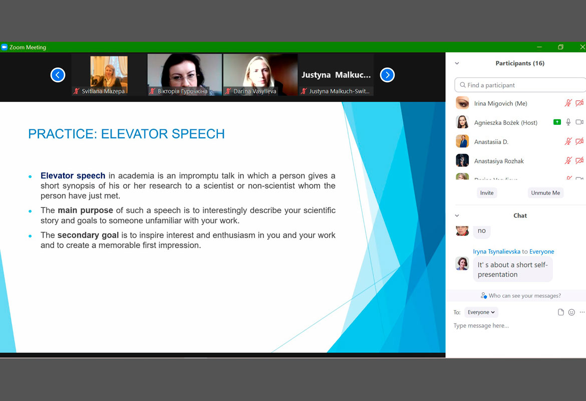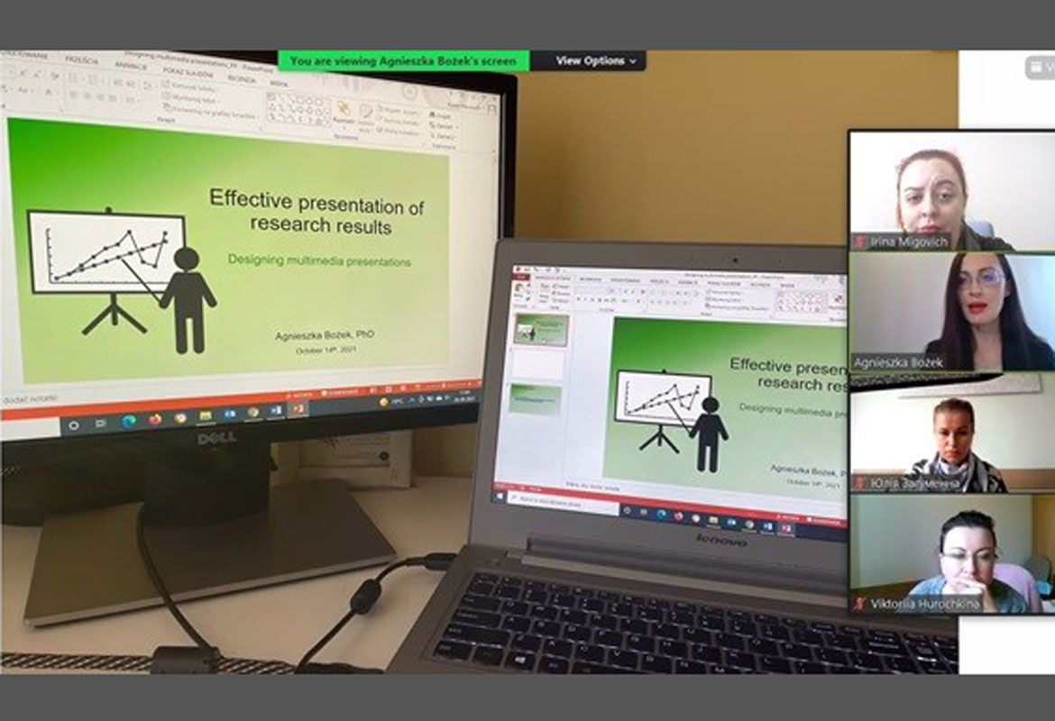 В.о. декана факультету іноземних мов, доктор педагогічних наук, професор, Ірина Мигович взяла участь у дводенному онлайн-тренінгу Public Speaking and Self-presenting for Researchers від Представництва «Польська академія наук», діяльність якого протягом останнього часу здійснюється на території Польської Республіки.