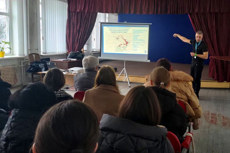 Олексій розповів про вибухонебезпечні предмети, саморобні, протипіхотні та протитранспортні вибухові пристрої, міни-пастки, типи травм, які можна отримати при контакті з вибухонебезпечними предметами.