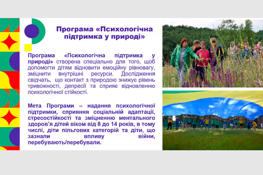 Зацікавив учасників семінару виступ Марії Вавер, координаторки громадської організації «Міжрегіональний центр наукових досліджень та експертиз», яка ознайомила з програмою Всеукраїнської екологічної ліги – «Психологічна підтримка у природі» для дітей, які зазнали впливу війни. Мета Програми – надання психологічної підтримки, сприяння соціальній адаптації, стресостійкості та зміцненню ментального здоров’я дітей віком від 8 до 14 років, в тому числі, діти пільгових категорій та дітей, що зазнали впливу війни, перебувають/перебували на територіях, на яких ведуться/велися бойові дії. Пані Марія презентувала також посібник «Програма «Психологічна підтримка у Природі».