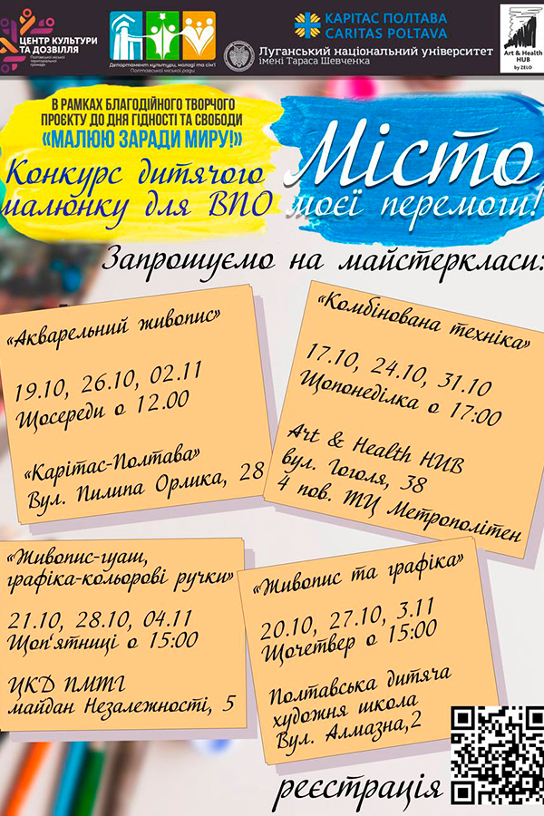 Протягом трьох тижнів проводяться майстер-класи з малювання в різних техніках для дітей-переселенців. Це можливість об’єднати людей, які тимчасово проживають на території Полтавщини заради спільної мети та надати дітям можливість зробити свій внесок у допомогу армії та перемогу.