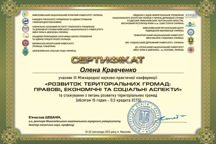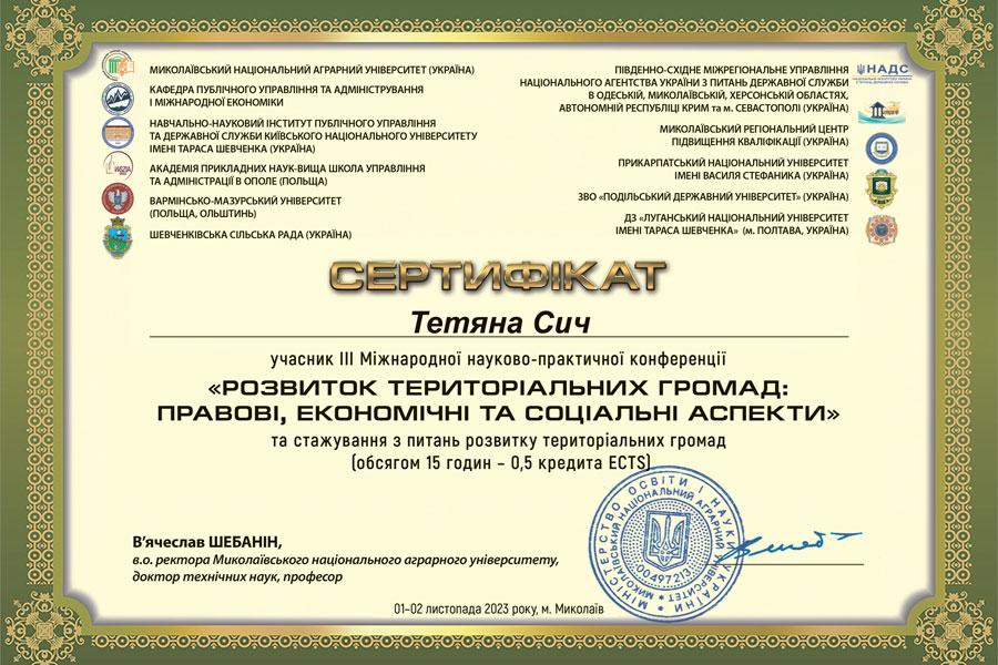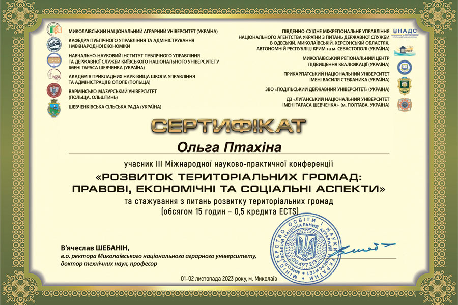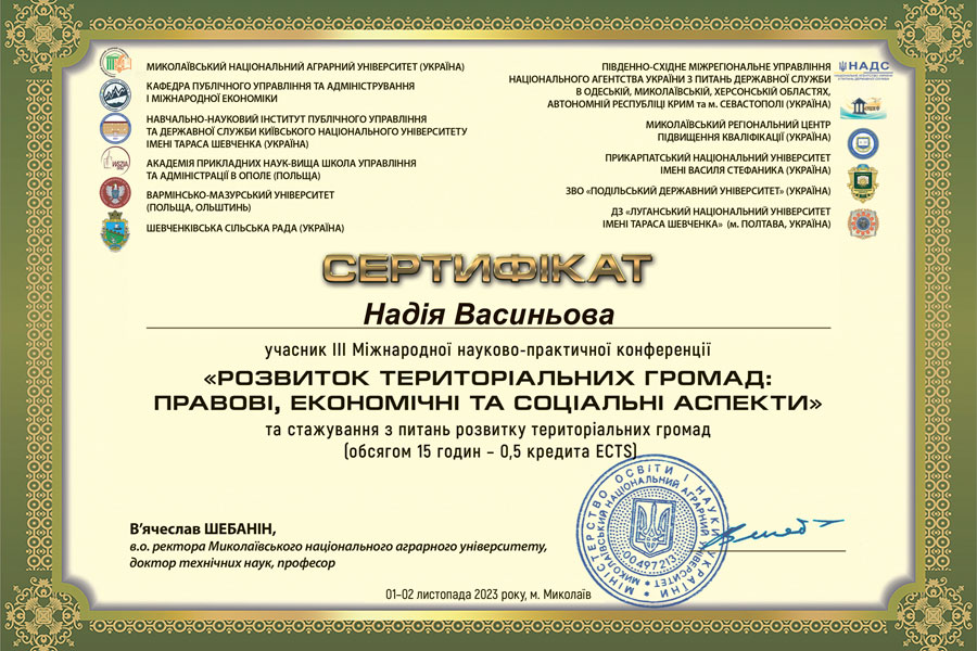 Науково-педагогічні працівники кафедри публічної служби та управління навчальними закладами Навчально-наукового інституту публічного управління і післядипломної освіти взяли участь у III Міжнародній науково-практичній конференції «Розвиток територіальних громад: правові, економічні та соціальні аспекти», яку проводила кафедра публічного управління та адміністрування і міжнародної економіки Миколаївського національного аграрного університету 02-03 листопада 2023 року. Співорганізаторами конференції виступав Навчально-науковий інститут публічного управління і післядипломної освіти ДЗ «Луганський національний університет імені Тараса Шевченка». Канд. пед. наук, доц., доцент кафедри публічної служби та управління навчальними закладами Надія Васиньова увійшла до групи членів оргкомітету конференції.