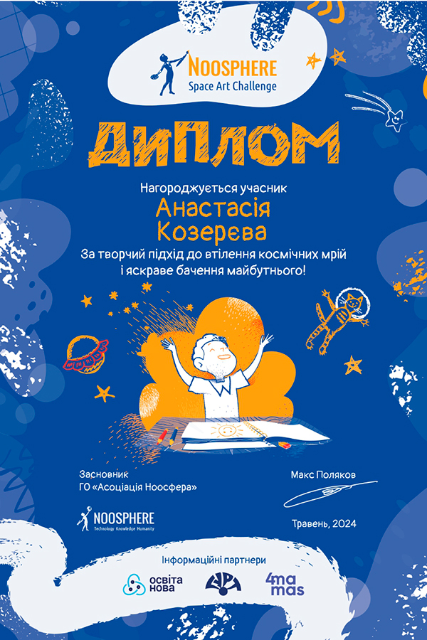 З 4 березня по 28 квітня за ініціативи ГО «Асоціація Ноосфера» (м. Київ) проходив Всеукраїнський конкурс малюнків на космічну тематику: Noosphere Space Art Challenge. В цьому році була рекордна кількість талановитих робіт українців – 28576. Кожна робота унікальна, адже в ній ховається велика мрія.