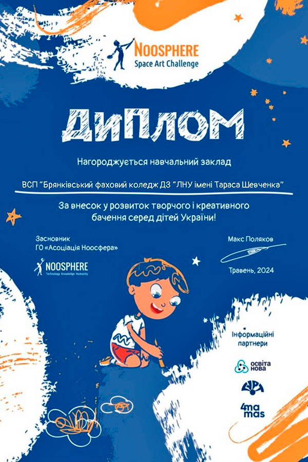 За внесок у розвиток творчого і креативного бачення серед дітей України дипломом нагороджений Брянківський фаховий коледж.
