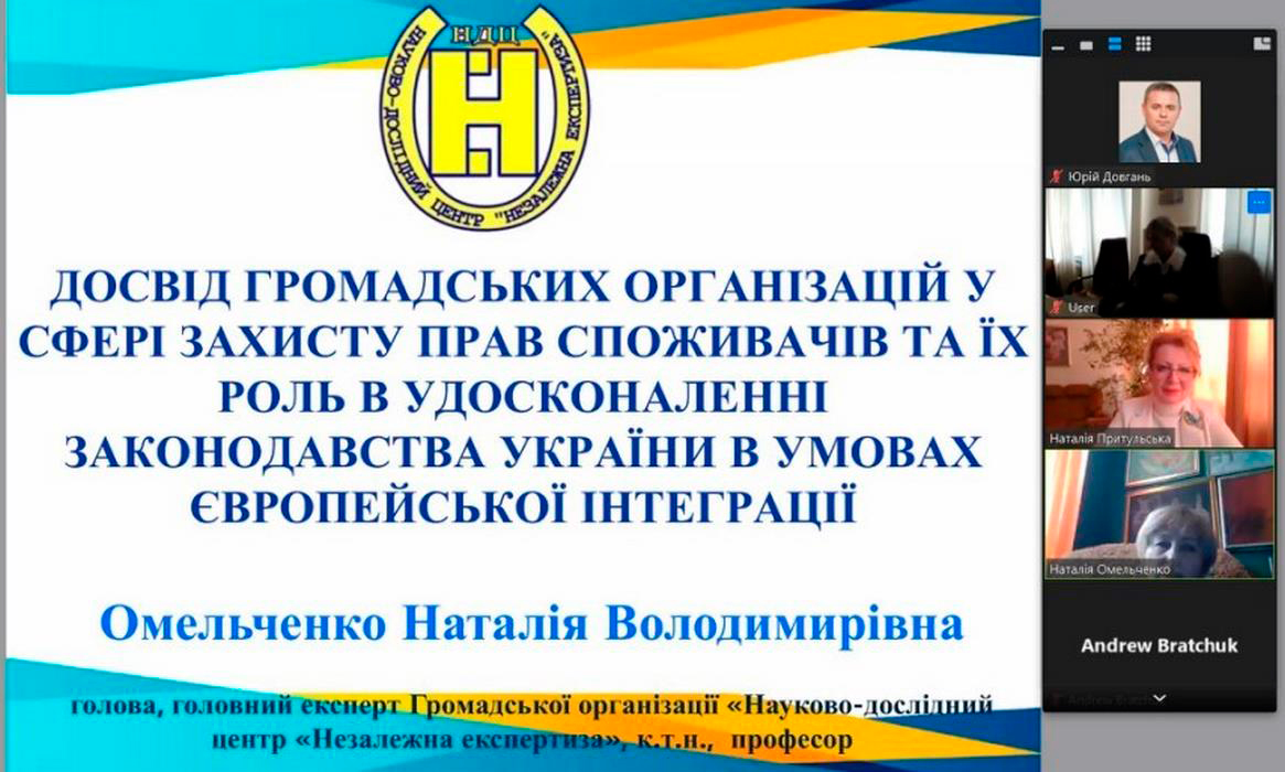 З доповіддю на круглому столі виступила Омельченко Н.В., кандидат технічних наук, професор, голова громадської організації «Науково-дослідний центр Незалежна експертиза» на тему: «Досвід громадських організацій у сфері захисту прав споживачів та їх роль в удосконаленні законодавства України в умовах Європейської інтеграції».