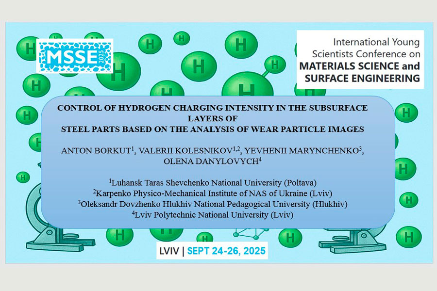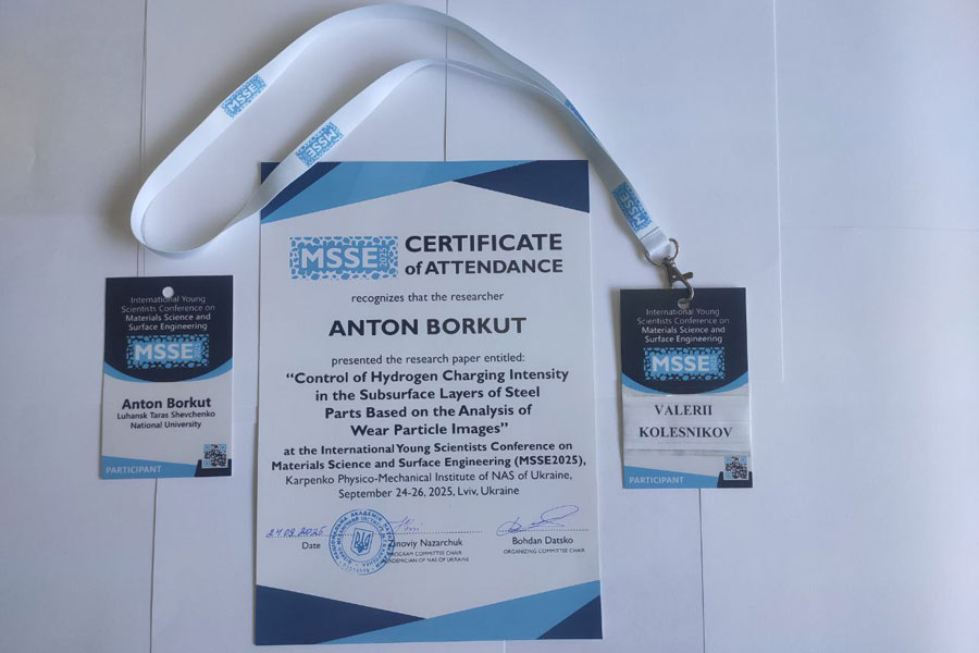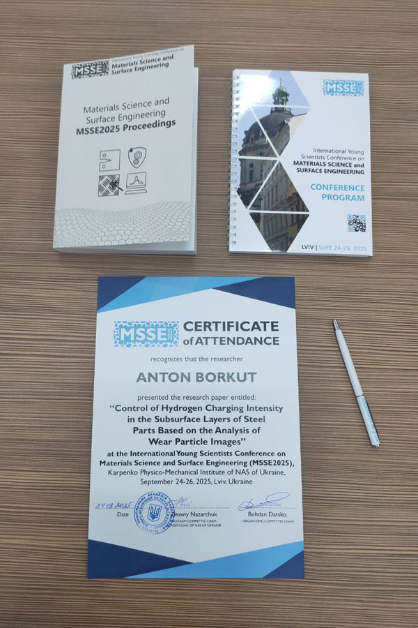 В збірнику матеріалів конференції опубліковані тези, співавторами яких є Колесніков Валерій і Боркут Антон, здобувач вищої освіти спеціальності «Професійна освіта (Аграрне виробництво, переробка сільськогосподарської продукції та харчові технології)»: «Borkut A., Kolesnikov V., Marynchenko Ye., Danylovych O. Control of Hydrogen Charging Intensity in the Subsurface Layers of Steel Parts Based on the Analysis of Wear Particle Images // Proceedings of the International Young Scientists Conference on Materials Science and Surface Engineering (MSSE2025). Karpenko Physico-Mechanical Institute of the NAS of Ukraine, Lviv, Ukraine, September 24–26, 2025. P. 262–265».
