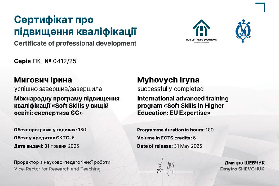 З 21.04.2025 по 31.05.2025 року начальник відділу міжнародних зв'язків ЛНУ імені Тараса Шевченка, доктор педагогічних наук, професор Ірина В. Мигович взяла участь у міжнародній програмі підвищення кваліфікації «Soft Skills у вищій освіті: експертиза ЄС», яку було реалізовано в межах Jean Monnet Center of Excellence of the Erasmus+ program «Hub of European Solutions» (№ 101127578 - HEUS - ERASMUS-JMO-2023-HEI-TCH-RSCH) на базі Національного університету «Острозька академія».