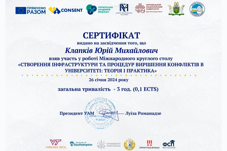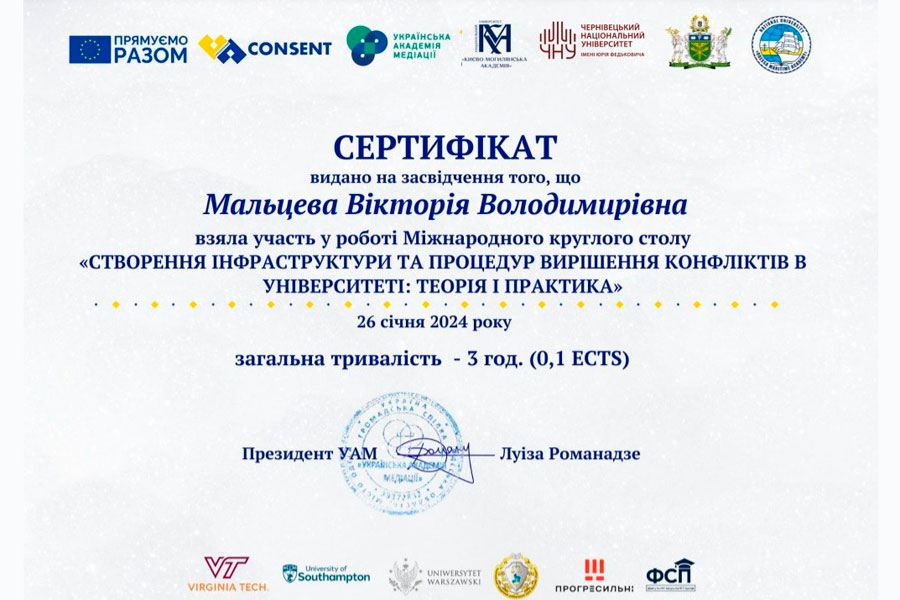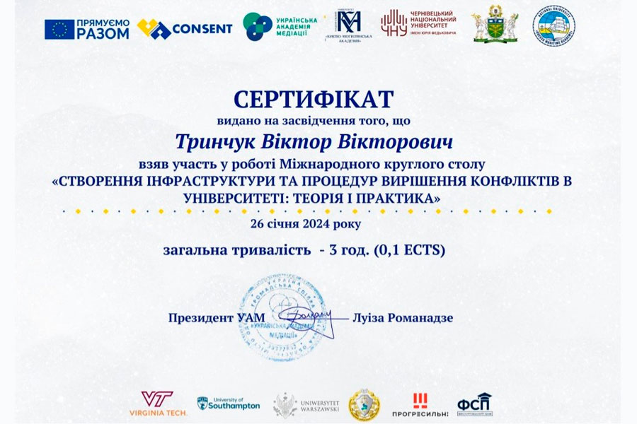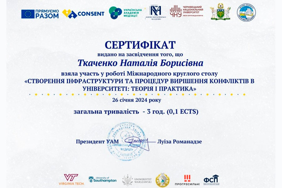 У рамках глобальної ініціативи, підтриманої Європейським Союзом у рамках проєкту «CONSENT: підвищення в Україні ролі альтернативного вирішення спорів з фокусом на медіацію», представники кафедри фінансів, обліку та банківської справи Луганського національного університету імені Тараса Шевченка професори Клапків Ю.М., Тринчук В.В. та доценти Мальцева В.В., Ткаченко Н.Б. долучилися до участі у Міжнародному круглому столі «Створення інфраструктури та процедур вирішення конфліктів в університеті: теорія і практика».