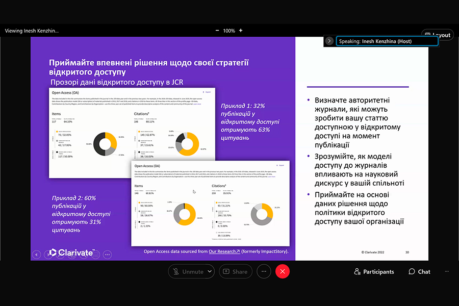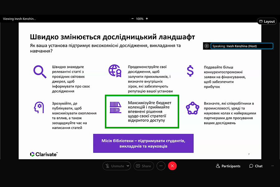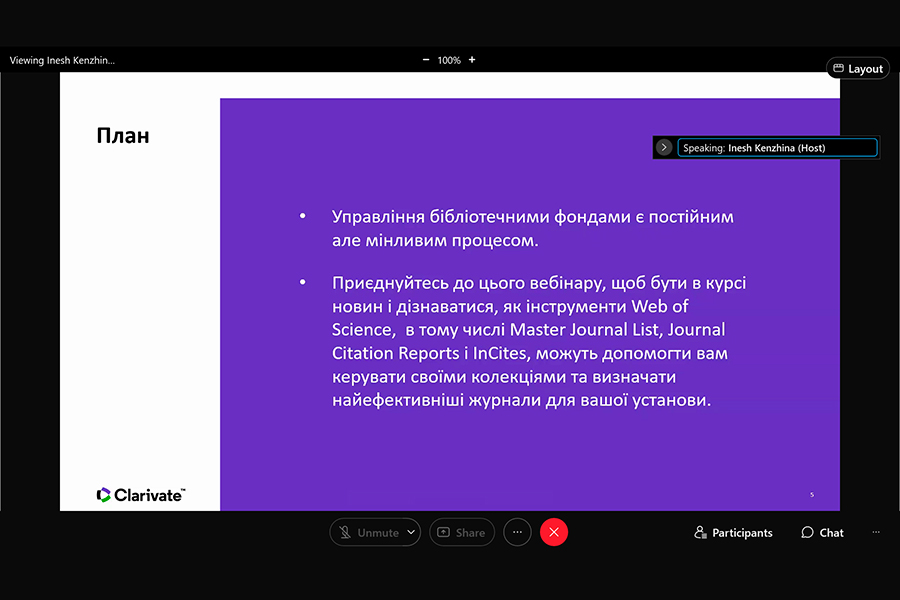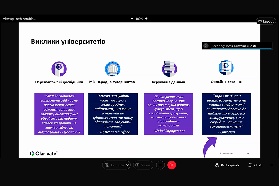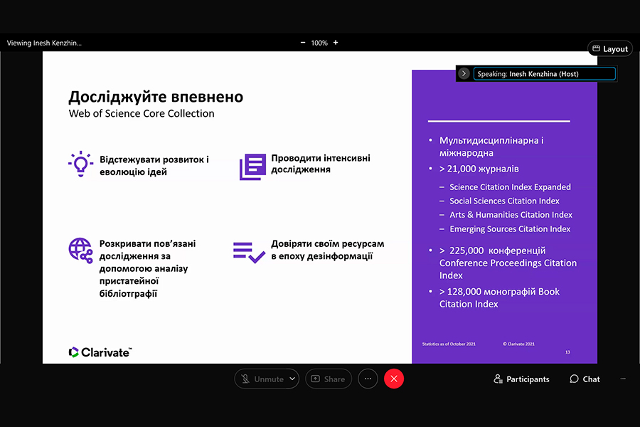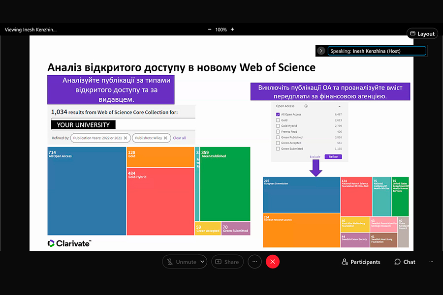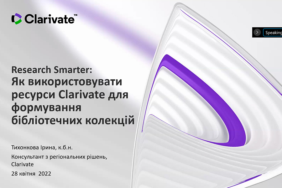 Захід було проведено консультантом з регіональних рішень Компанії Clarivate Analytics (головний офіс: Лондон, Велика Британія ) Іриною Тихонковою. Під час вебінару з’ясовано: проблеми з якими зіштовхуються науково-педагогічні працівники українських та іноземних університетів; потребу у створенні власних колекцій з використанням всіх можливих інструментів, зокрема, ресурсів Clarivate.