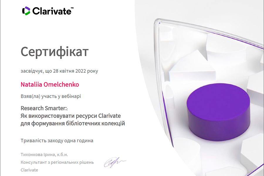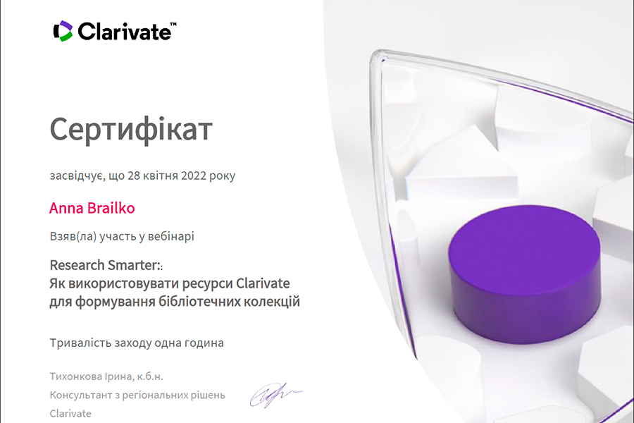 Так, науково-педагогічні працівники кафедри товарознавства, торговельного підприємництва та експертизи товарів НН ІТОТТ долучилися до роботи наукового вебінару з питань важливості створення актуальних наукових колекцій: «Register for Research Smarter: як використовувати ресурси Clarivate для формування бібліотечних колекцій».