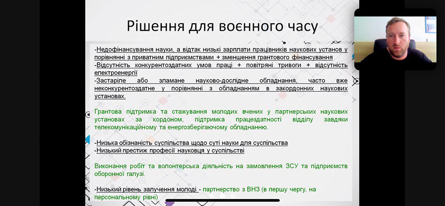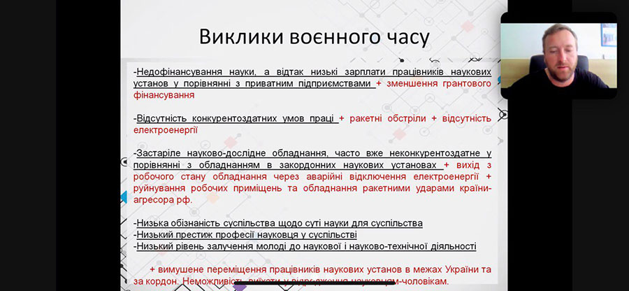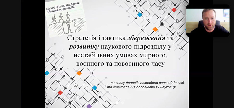 Своїм досвідом керування науковим підрозділом поділився молодий доктор технічних наук, завідувач відділу зварювання пластмас Інституту електрозварювання ім. Є. О. Патона НАН України, професор Максим Юрженко. Доповідач окреслив тактичні дії для досягнення довгострокових великих цілей збереження та тактичні дії для досягнення довгострокових великих цілей розвитку наукового підрозділу, виклики мирного часу та відповідні до них рішення, а також виклики воєнного часу й рішення для воєнного часу. Особливу увагу приділили прогнозуванню стану науки у повоєнний час та розгляду рішень щодо збереження та розвитку наукового підрозділу у повоєнний час, а саме: спрощення умов ведення наукової та науково-технічної діяльності, збільшення фінансування науки у відповідності до Закону України «Про наукову і науково-технічну діяльність» (його виконання), відкриття можливостей для участі українських науковців та наукових установ у Європейських програмах на рівних правах з науковцями та науковими установами країн ЄС, відкриття структурних фондів, державна політика сприйняття розвитку наукоємних підприємств (в тому числі оборонної галузі) та їх співробітництву з науковими установами, державна політика в сфері популяризації науки та освіти.