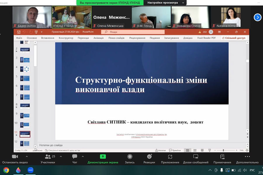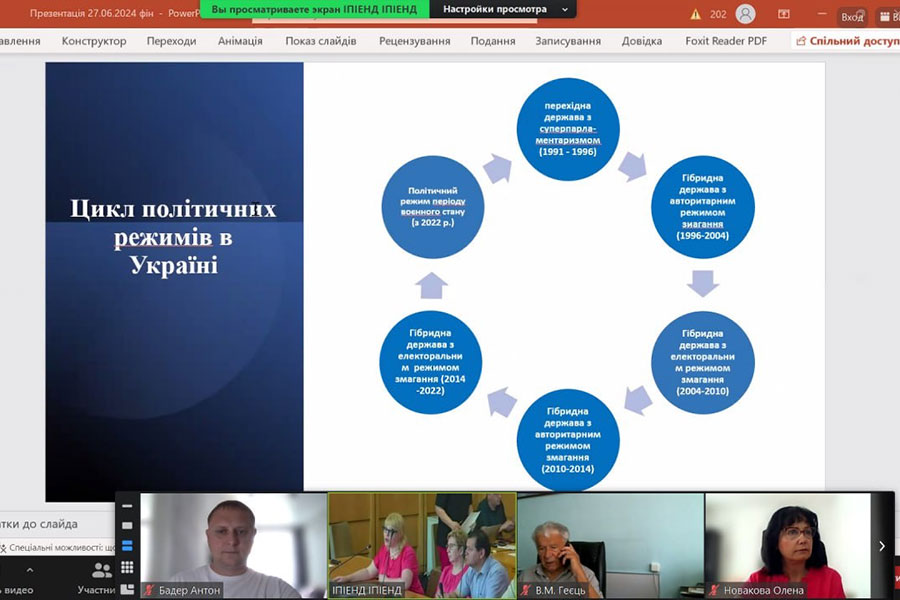 27 червня 2024 р. викладачі кафедри політології і міжнародних відносин навчально-наукового інституту соціальних і гуманітарних наук Антон Бадер, доктор політичних наук, Світлана Вовк, доктор політичних наук, і Олена Меженська, кандидат політичних наук прийняли участь у презентації та обговоренні результатів дослідження «Адаптивні зміни політичного поля України в умовах війни».
