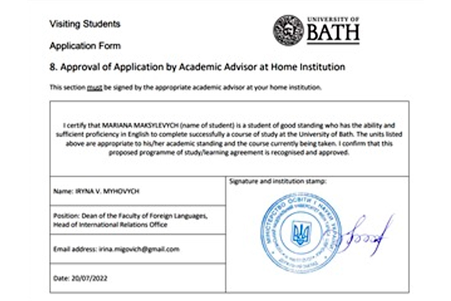 Студентка 3 курсу факультету іноземних мов спеціальності «035.041 Філологія. Германські мови та літератури (переклад включно), перша - англійська. Переклад (англійська мова та друга іноземна мова (китайська))» Марьяна Максилевич отримала змогу взяти участь в міжуніверситетській програмі мобільності з Університетом Бата, графство Сомерсет, Великобританія. Університет Бата (University of Bath), є державною освітньою та дослідницькою установою; заснований та удостоєний королівської хартії у 1966 році. В рейтингу Research Excellence Framework 2014 року 32% дослідницьких проєктів університету отримали найвищу можливу оцінку 4*, що визначається як провідна у світі з точки зору оригінальності, значущості та доброчесності. Річний дохід установи за 2020-2021 роки склав 289,5 млн. фунтів стерлінгів, з яких 37,2 мільйонів було отримано від дослідницьких грантів та контрактів.