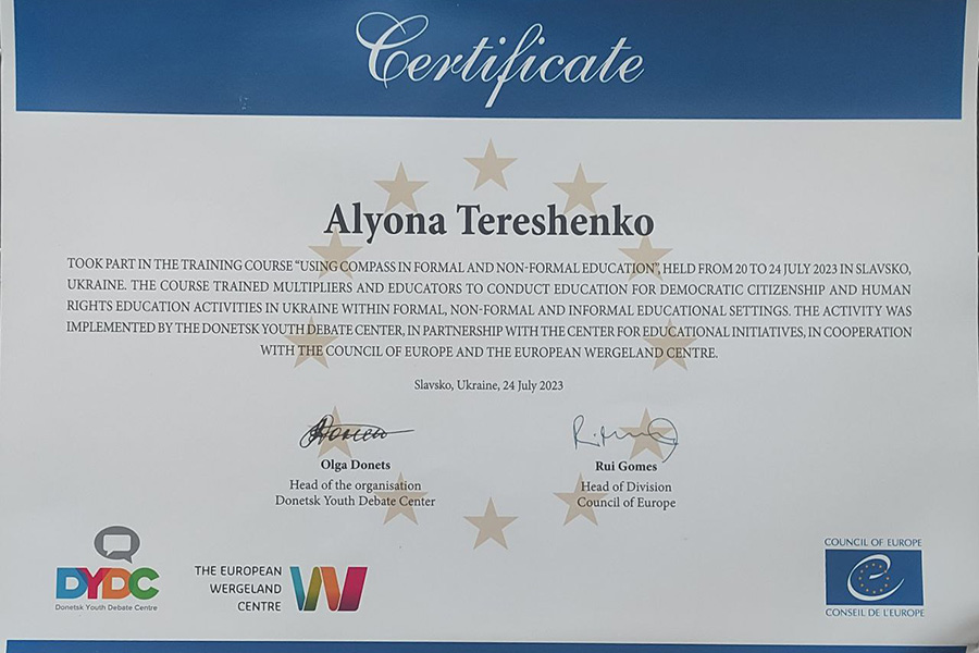 З 20 по 24 липня заступник директора НН ІКМ з соціально-гуманітарної роботи Альона Терещенко пройшла п’ятиденний Національний тренінговий курс з освіти з прав людини: використання посібника «Компас» у формальній і неформальній освіті, який проходив у смт Славсько, Львівська область.