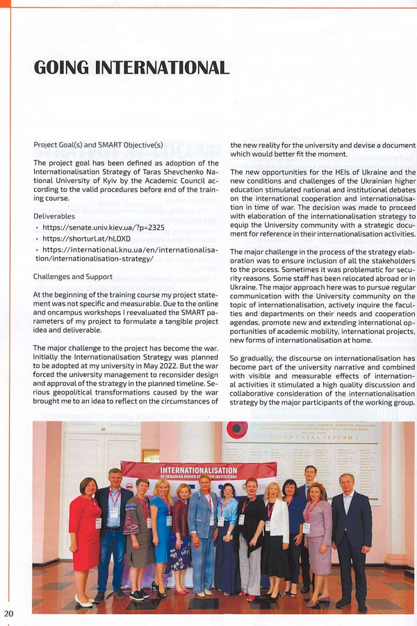 Крім інтенсивної навчальної складової (воркшопи, менторські сесії, нетворкінг-зустрічі, онлайн-презентації тощо), ознайомлення з кращими міжнародними практиками та обміну досвідом щодо інтернаціоналізації академічних проєктів, програма стажування також передбачала підготовку кожним з учасників індивідуального проєкту щодо можливостей та перспектив розвитку цього напряму в ЗВО, який він представляє.