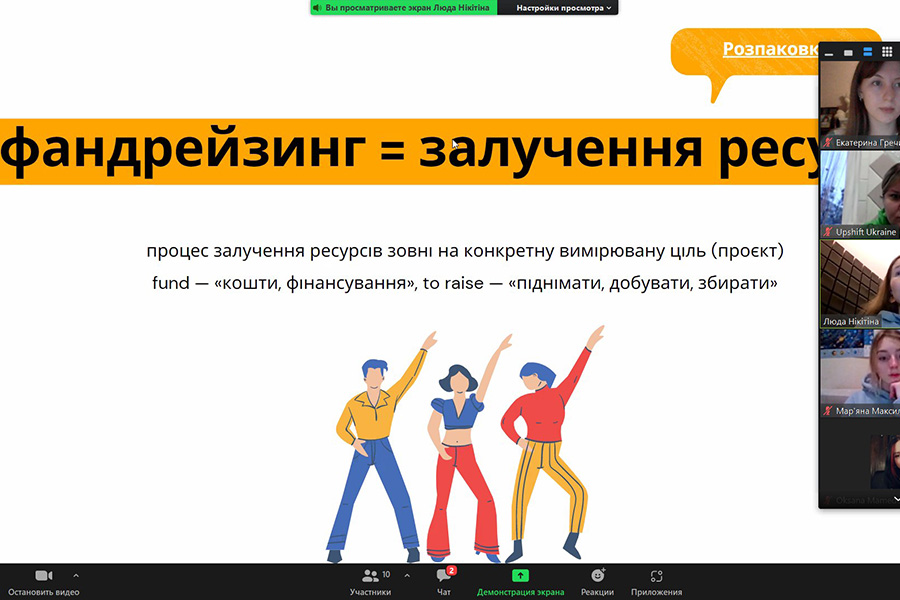 Здобувачки освіти факультету іноземних мов Катерина Гречишкіна, Мар’яна Максилевич та Валерія Лихачова разом з менторкою програми Upshift Ukraine, викладачкою кафедри східних мов Оксаною Гусаковою, продовжують участь у проєкті від Дитячого фонду ООН (ЮНІСЕФ). Наразі, учасниці розробляють план заходів власного освітнього проєкту, мета якого ознайомити вчителів закладів загальної середньої освіти з новітніми технологіями і можливостями застосування їх на уроках. 19 січня відбувся вебінар для учасників 26 хвилі UPSHIFT із залучення додаткових ресурсів до проєктів. Команди дізналися як працює фандрейзинг, чим краудфандинг відрізняється від грантрайтинга. Спікеркою зустрічі була Людмила Нікітіна – комунікаційна менеджерка платформи ,,Моє Містоˮ в Харкові, засновниця платформи для молоді ,,Твій космос можливостейˮ, майстерні ,,Бери й робиˮ та Харківського осередку програми ,,Будуємо Україну Разомˮ, комунікаційна менеджерка фестивалю соціальних інновацій та нової музики Plan B та Дня Музики в Харкові, грантерка ,,Фонду Родини Богдана Гаврилишинаˮ у програмі ,,Молодь змінить Українуˮ 2019 року, менторка в програмі ,,Зміцнення громадянського активізму серед молодіˮ 2021 та 2022 роки.