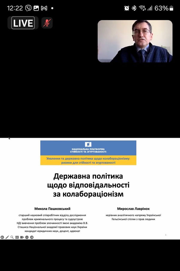 Під час заходу були презентовані ключові висновки соціологічних досліджень, що стосуються ставлення суспільства до колабораціонізму та відповідальності за нього; проаналізовано законопроєкти щодо відповідальності за колабораціонізм; відбулося обговорення актуальних змін у правовому регулюванні.