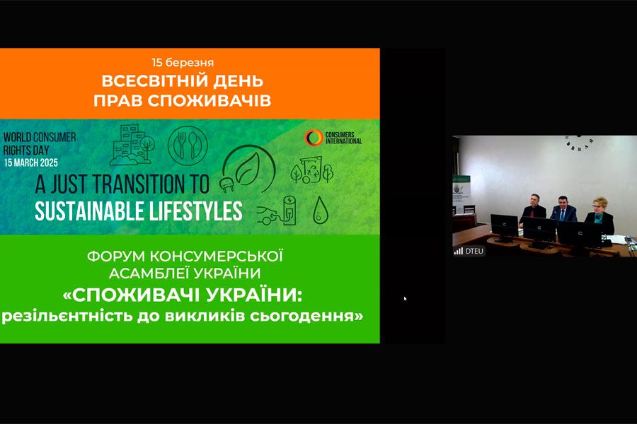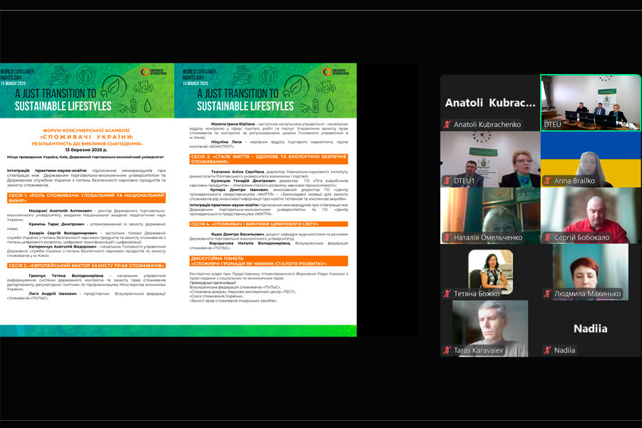 Науково-педагогічні працівники кафедри товарознавства і торгівельного підприємництва разом із здобувачами освітньої програми (ОП) «Товарознавство та експертиза в митній справі» бакалаврського та магістерського рівнів вищої освіти 13.03.2025 р. взяли участь у роботі форуму Консумерської асамблеї України: споживачі України: резільєнтність до викликів сьогодення з нагоди відзначення Всесвітнього дня прав споживачів.