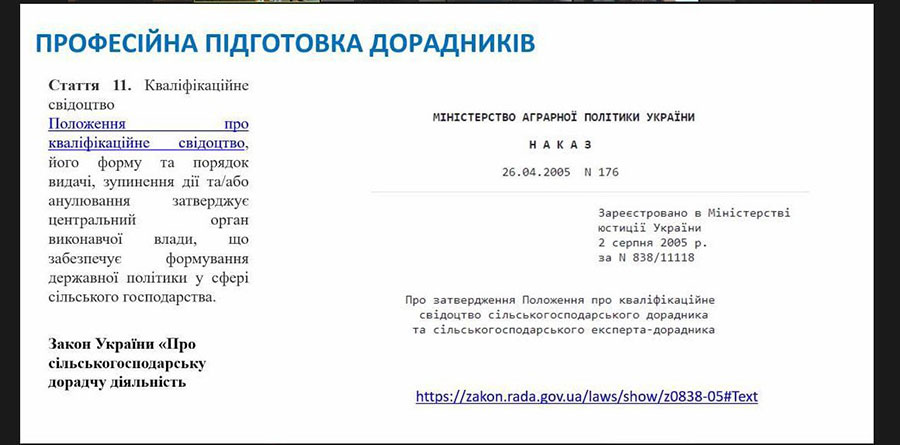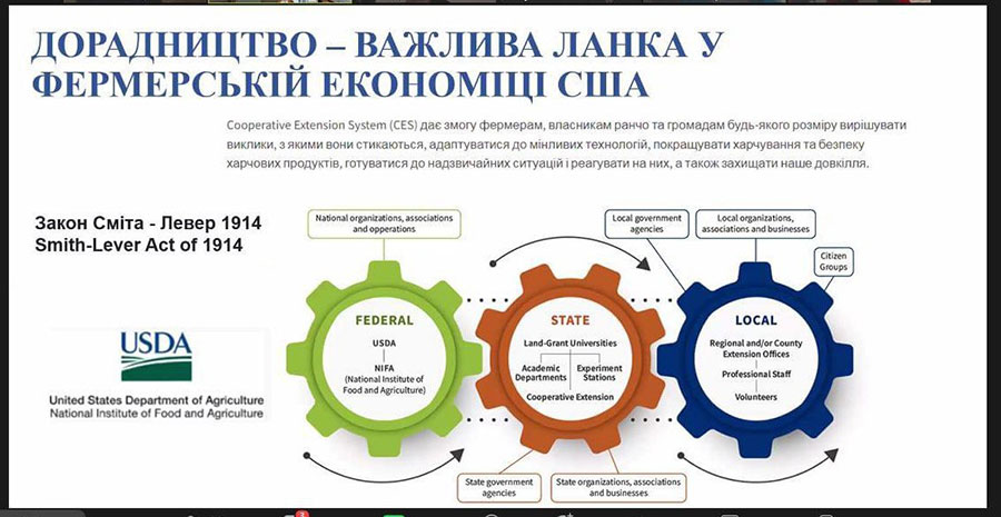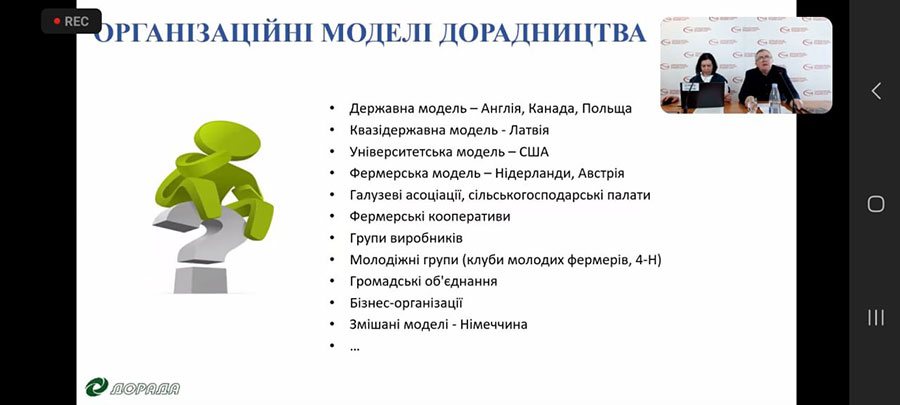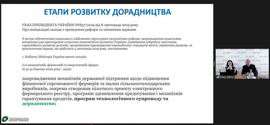 Залучення українських закладів освіти до такої діяльності має на меті позитивно вплинути на розвиток сільського господарства та сільської місцевості. Спікери ознайомили учасників з підходами та процедурами участі закладів вищої та фахової передвищої освіти України в сільськогосподарській дорадчій діяльності, зокрема щодо набуття статусу сільськогосподарської дорадчої служби, надання дорадчих послуг, участі у підготовці фахівців для сільськогосподарської дорадчої діяльності – ключові аспекти семінару