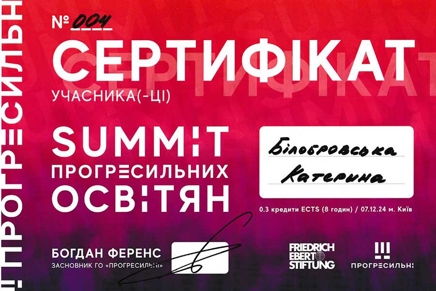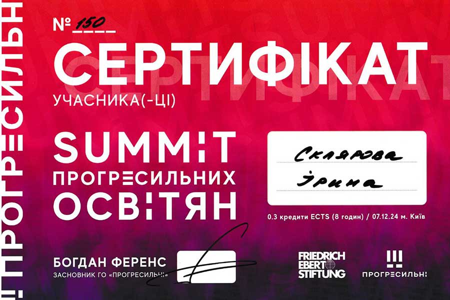 Катерина Білобровська, доктор філософії з філології, викладач кафедри іноземних мов за професійним спрямуванням, заступник директора з навчальної роботи та Ірина Склярова, викладач кафедри романо-германської філології, заступник директора з наукової роботи й англомовної підготовки 07 грудня 2024 року взяли участь у Summit прогресильних освітян, що відбувся в офлайн форматі у м. Київ.