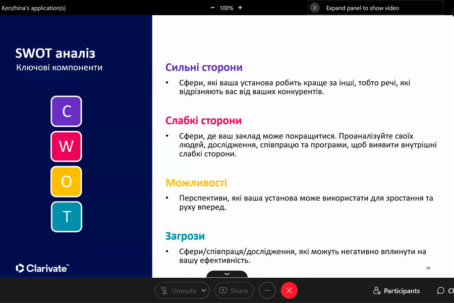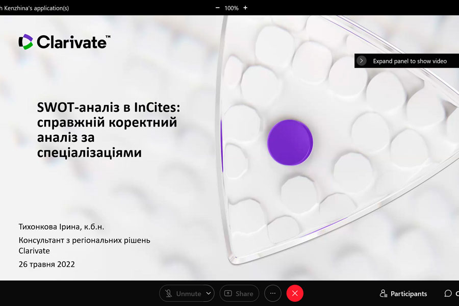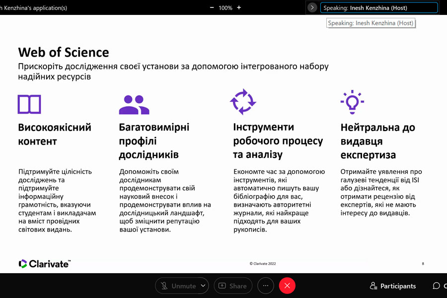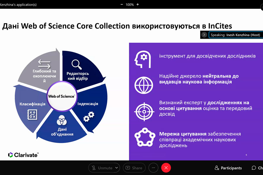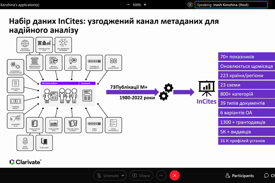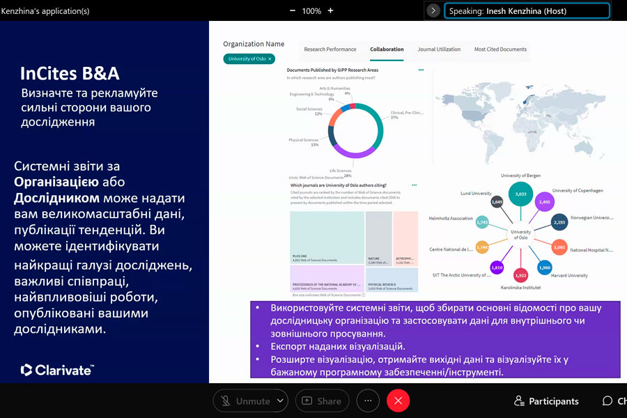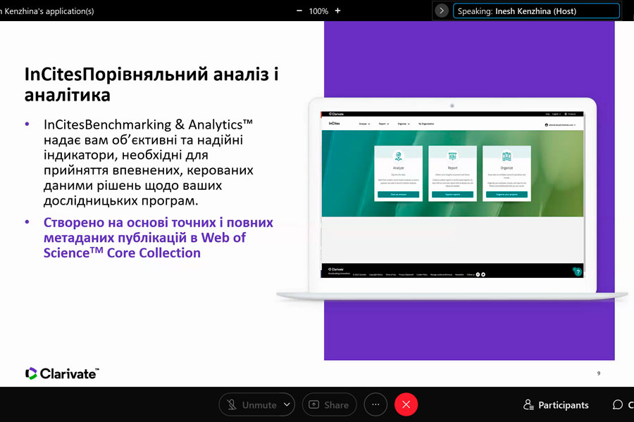 Під час участі в онлайн-заході із серії «Research Smarter» учасники довідалися про InCites Benchmarking & Analytics (створений на основі точних і повних метаданих публікацій в Web of Science TM Core Collection), який надає об’єктивні та надійні індикатори, необхідні для прийняття впевнених, керованих даними рішень щодо дослідницьких програм. Разом із тим з’ясували, як коректно аналізувати продуктивність інституцій, оцінювати співпрацю, визначати експертів у тематиці, демонструвати сильні сторони, відкривати можливості, порівнювати з аналогами.